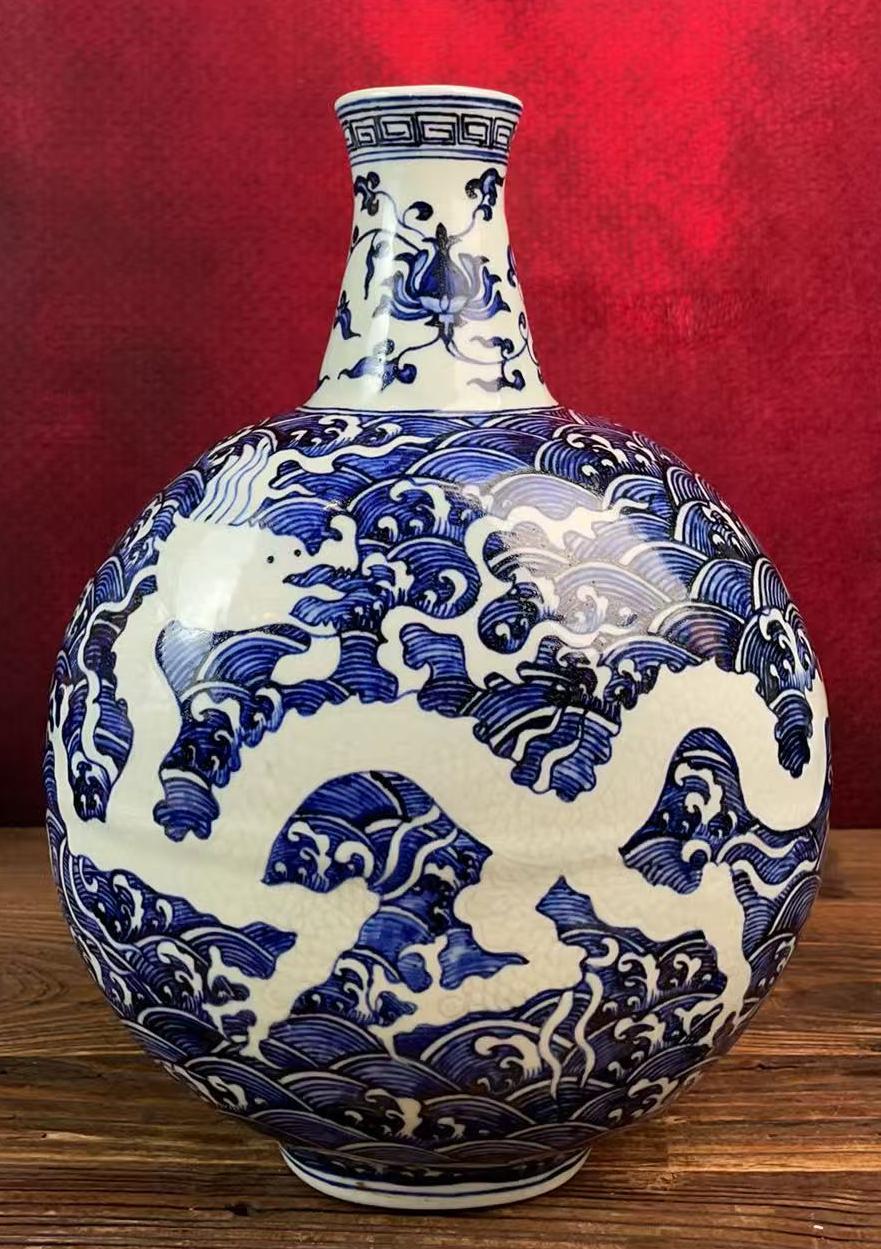 明永乐青花留白海水龙纹扁瓶