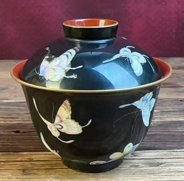名称:清乾隆乌金釉粉彩百蝶纹盖碗