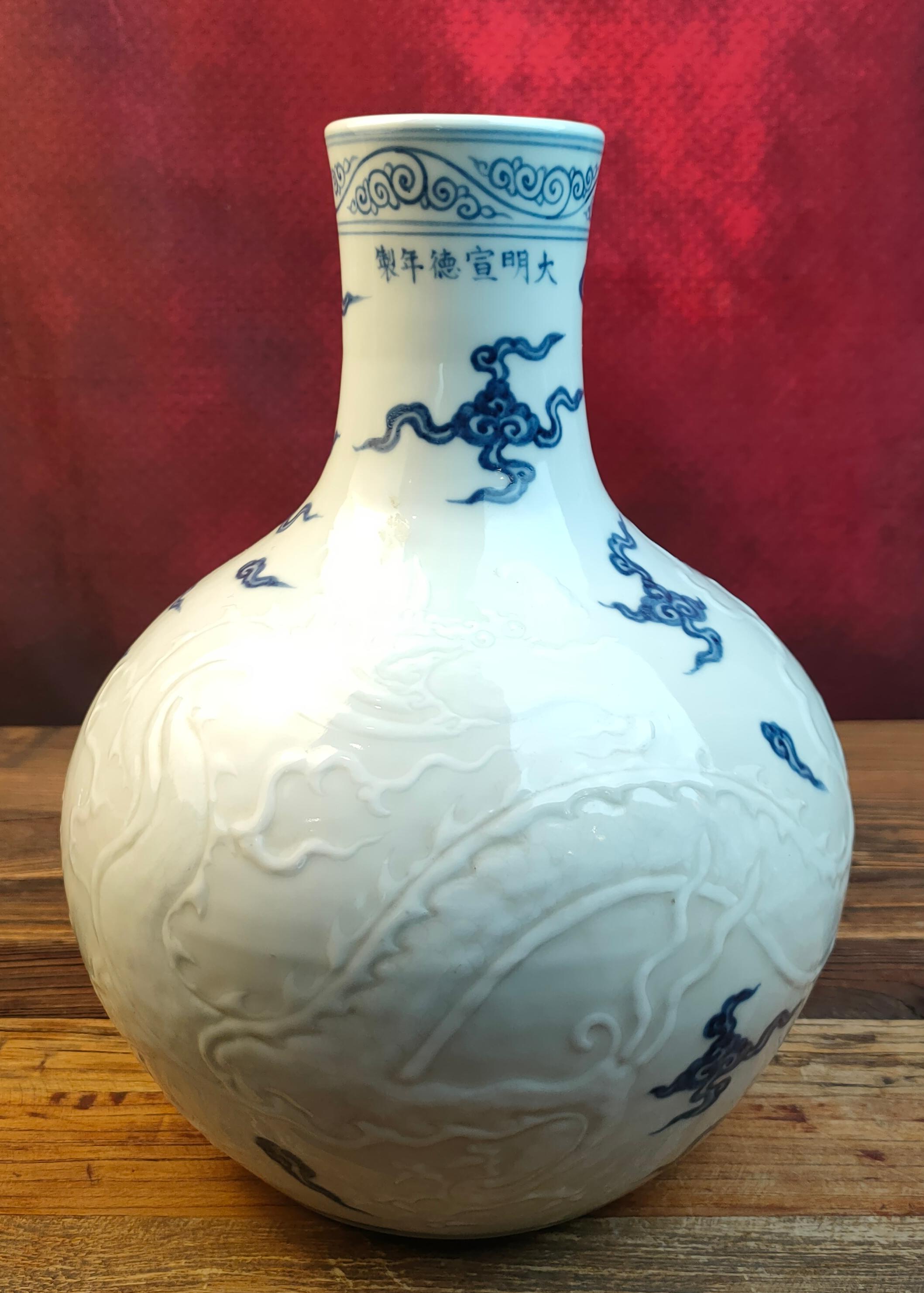 明宣德青花浮雕云龙纹天球瓶