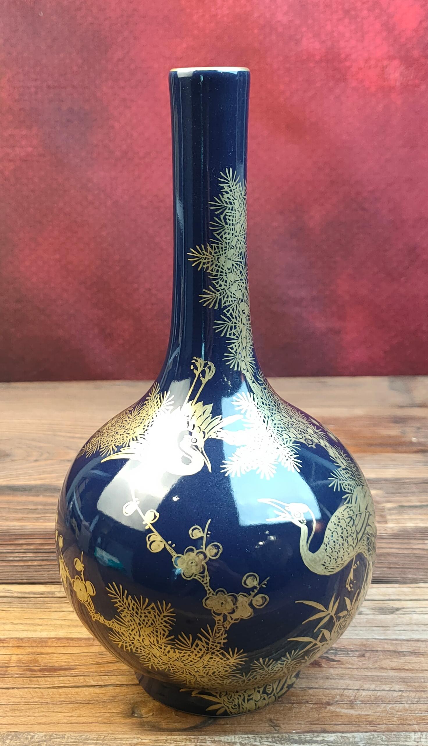 名称:清乾隆蓝釉描金松鹤延年图长颈瓶
