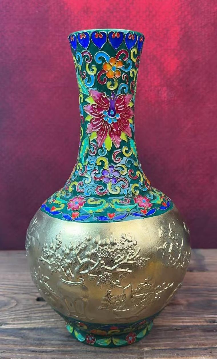 清乾隆掐丝珐琅描金浮雕花卉纹长颈瓶