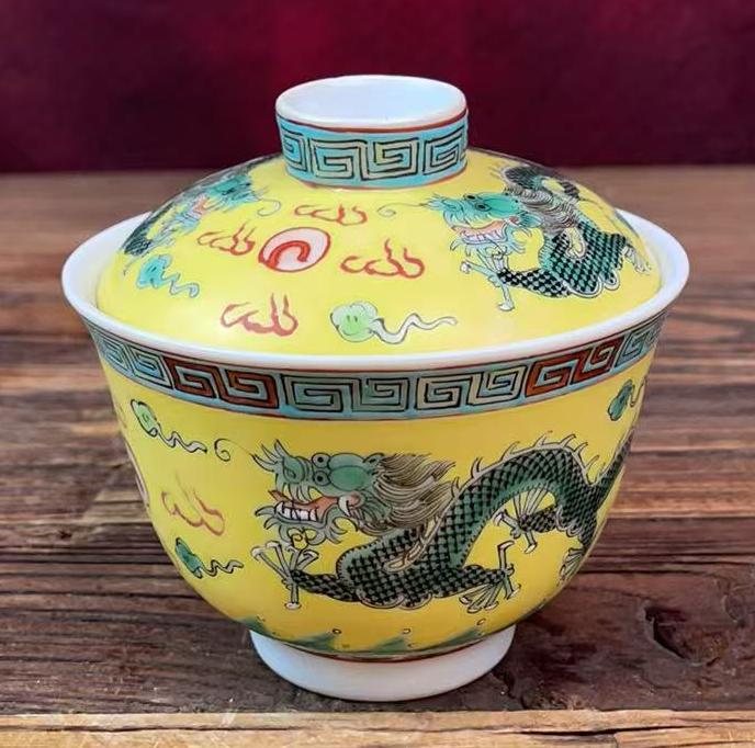 名称:清光绪粉彩二龙戏珠纹盖碗