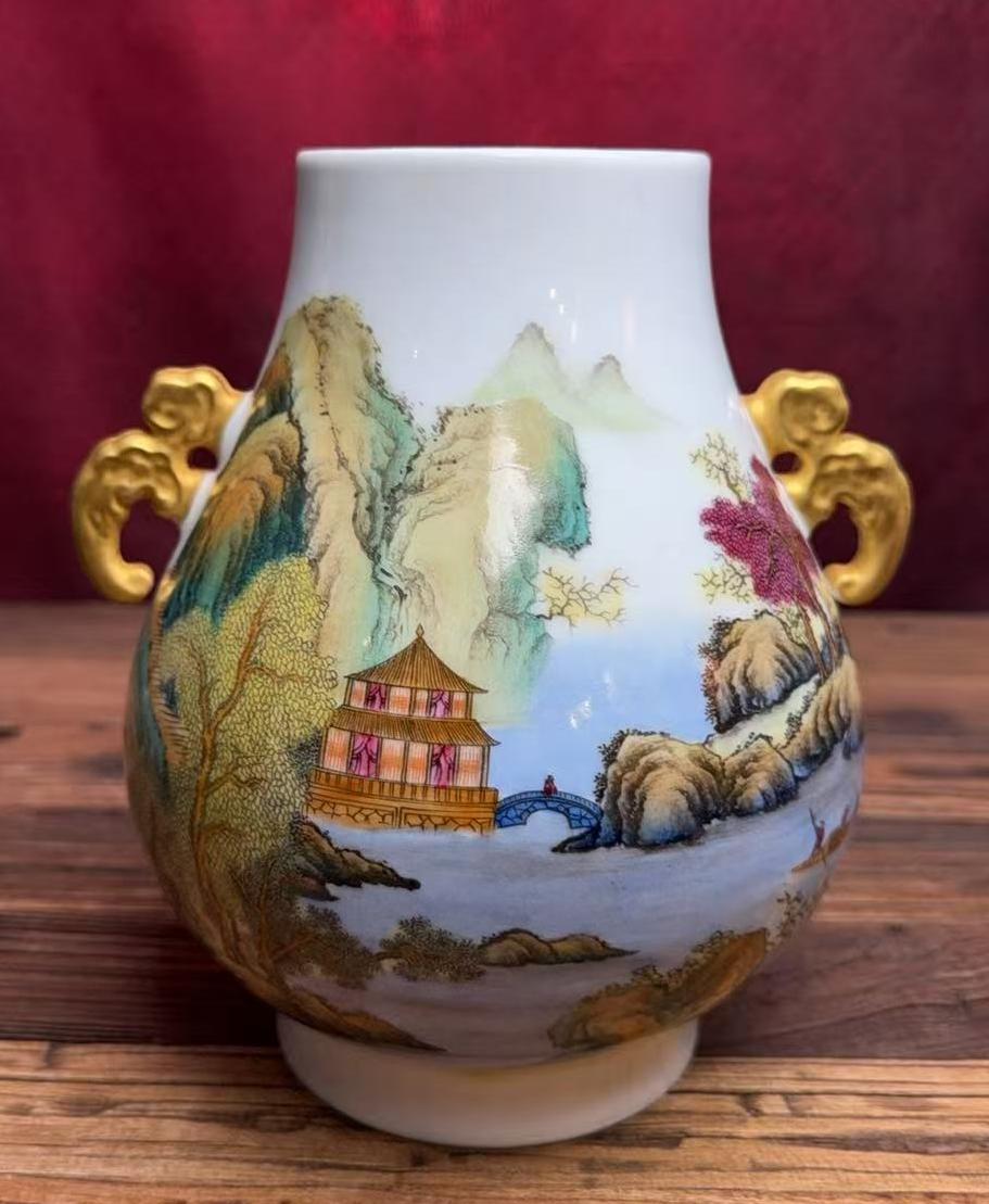 清乾隆珐琅彩描金山水楼阁纹双耳尊