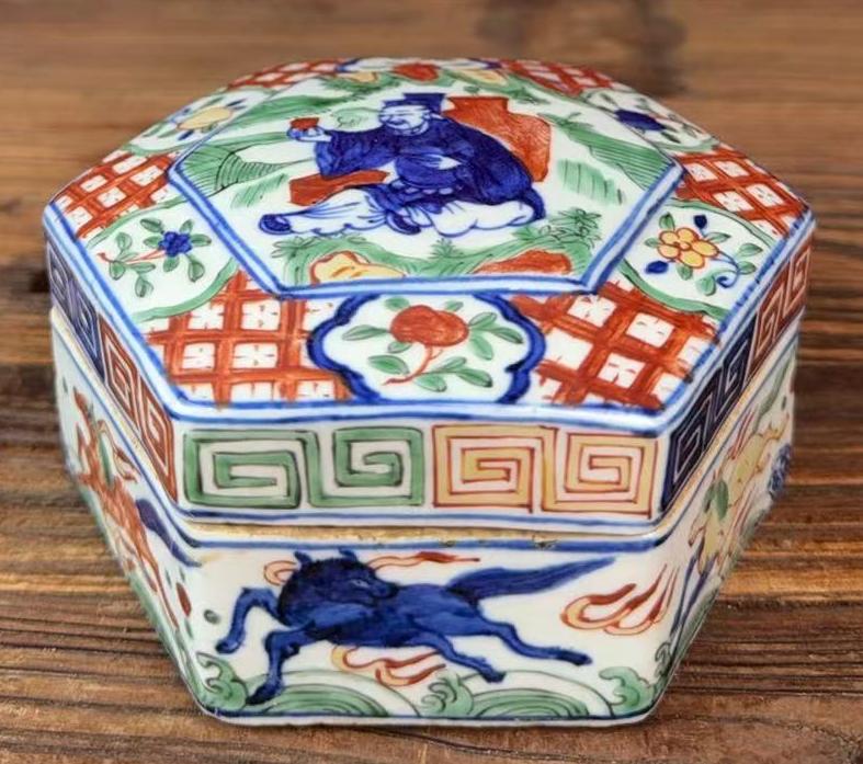 名称:明万历青花五彩开窗人物纹六方盖盒