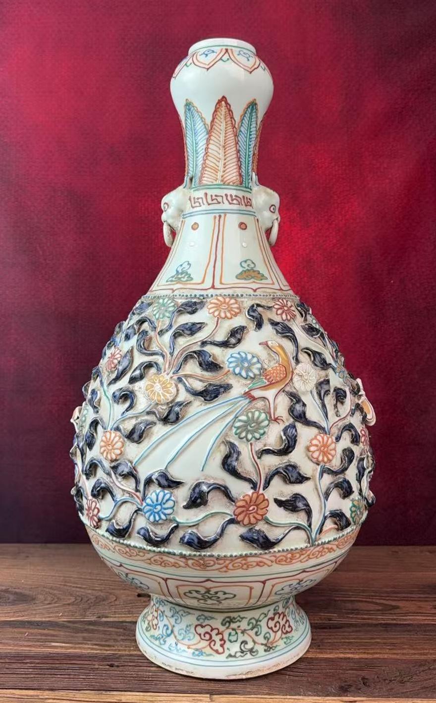 明早期青花五彩浮雕花鸟纹蒜头瓶