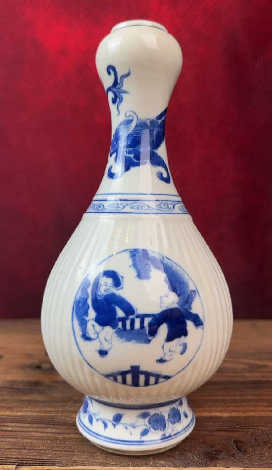 清康熙青花开窗婴戏纹蒜头瓶