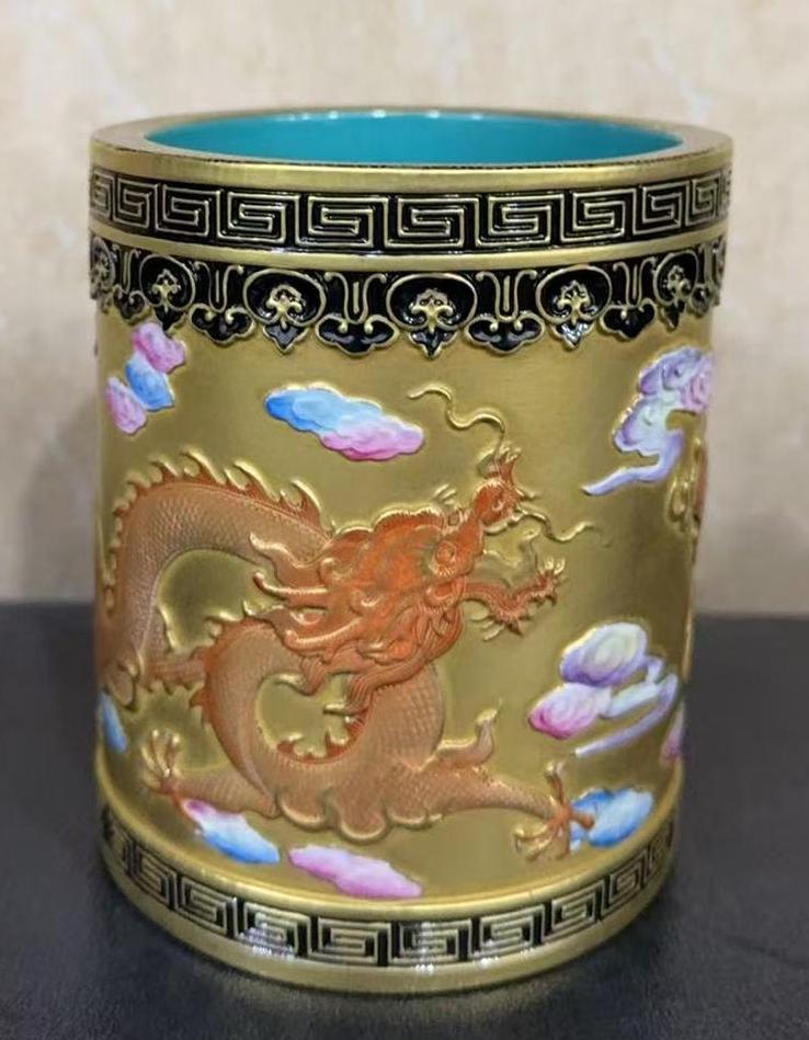 名称:清乾隆粉彩矾红描金浮雕云龙纹笔筒