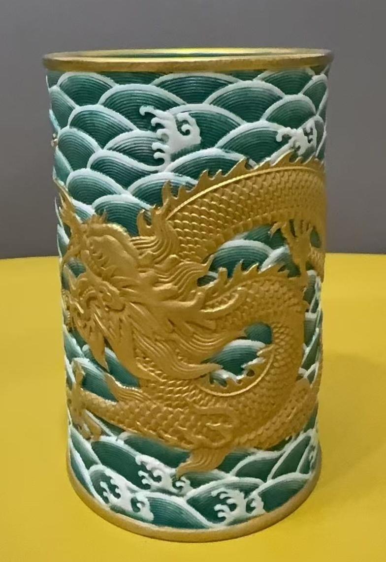 清乾隆粉彩浮雕海水龙纹笔筒