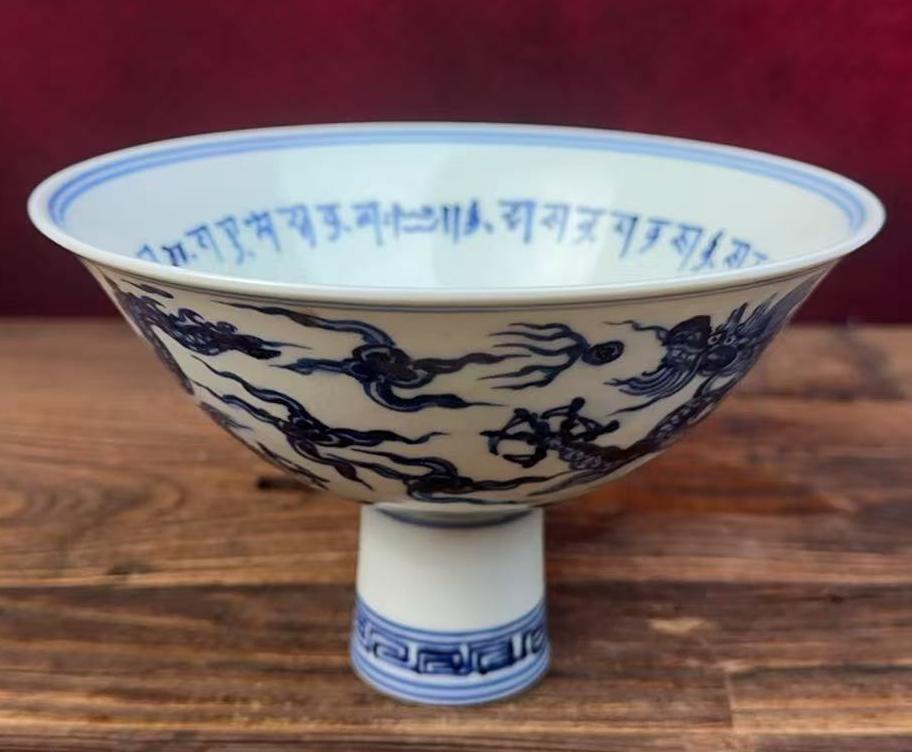明宣德外青花云龙纹内梵文高足碗