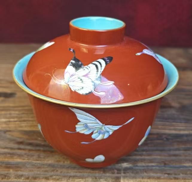 名称:清雍正珊瑚红地珐琅彩百蝶纹盖碗