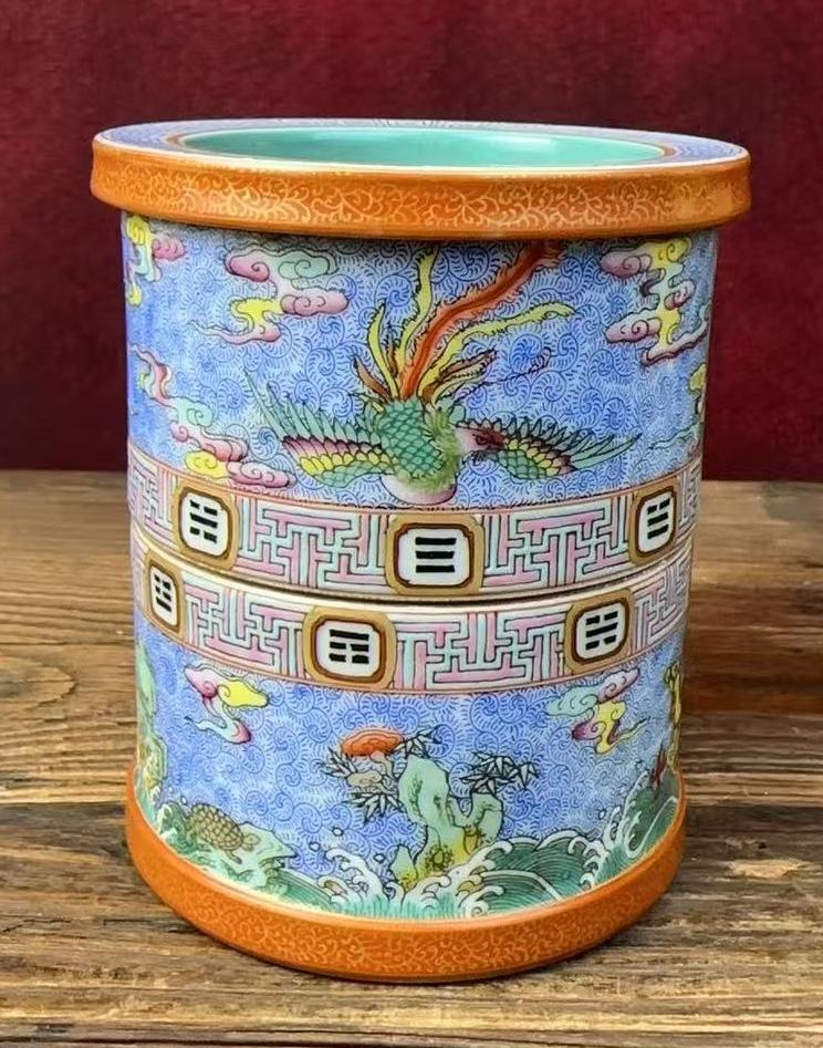 清乾隆粉彩矾红描金旋转笔筒