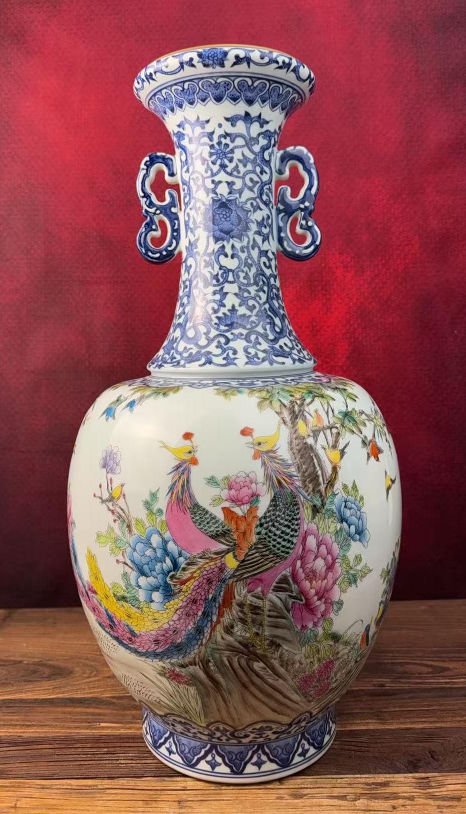名称:清乾隆青花粉彩花鸟纹双耳长颈瓶