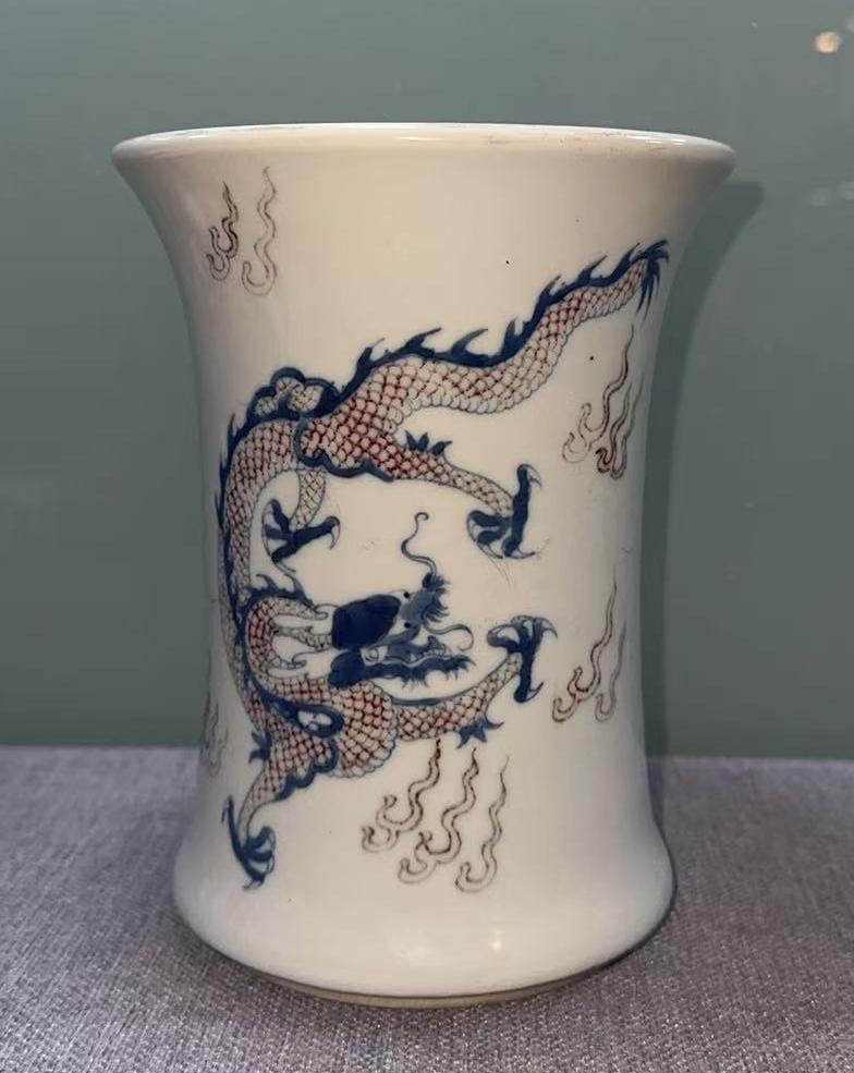 名称:清顺治青花釉里红龙纹笔筒