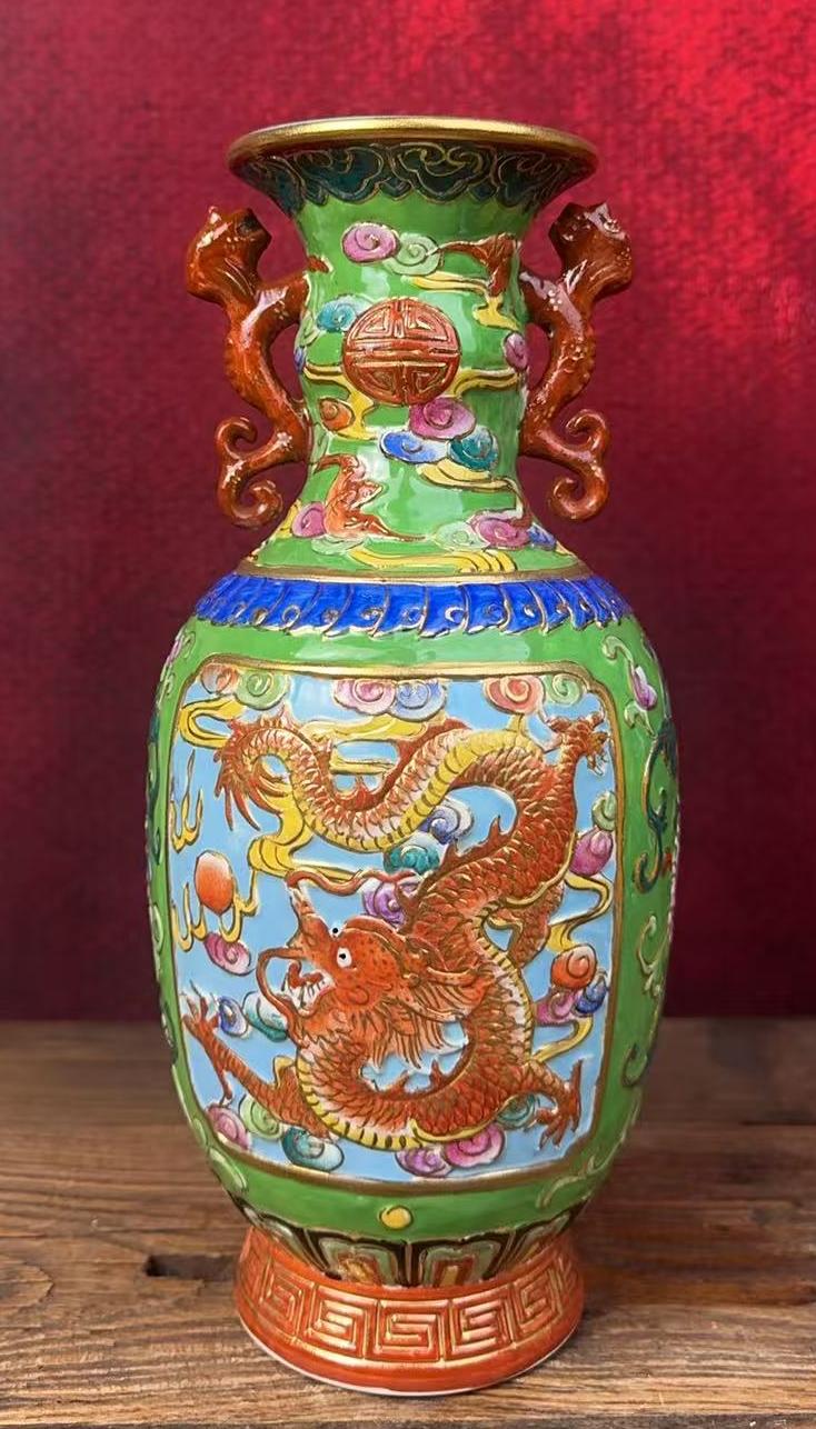 名称:清乾隆仿漆釉描金开窗云龙纹双耳瓶