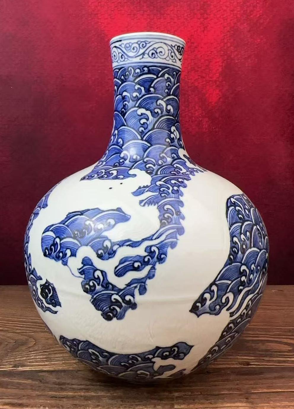 名称:明永乐青花留白海水龙纹天球瓶