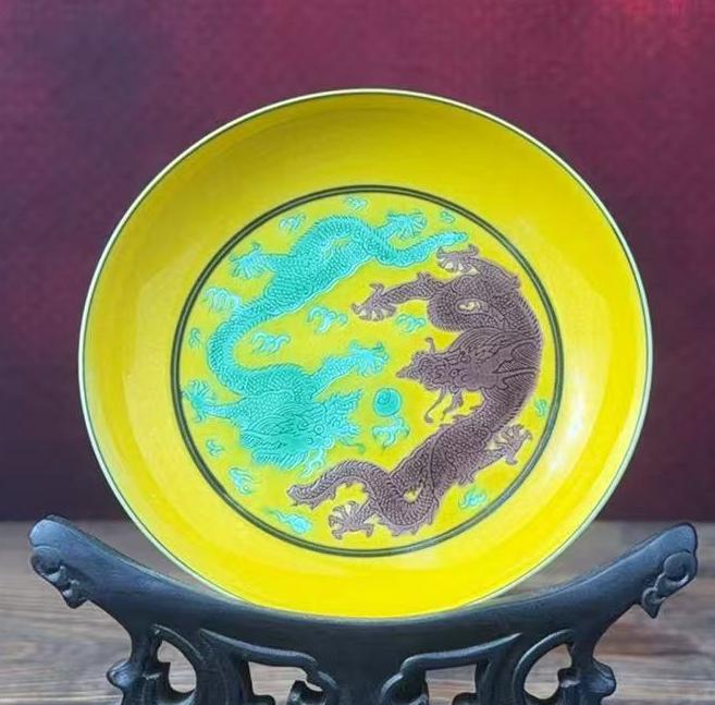 名称:清道光素三彩二龙戏珠纹盘