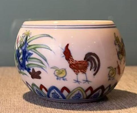 名称:明成化斗彩洞石锦鸡纹水盂