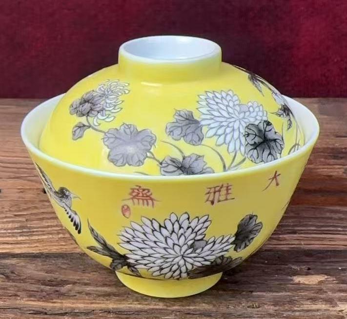 名称:清大雅斋黄地墨彩花卉纹盖碗