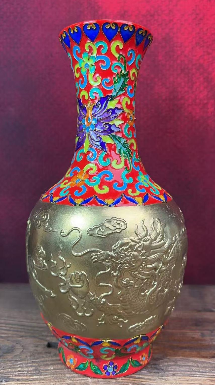 清乾隆掐丝珐琅描金浮雕龙纹长颈瓶