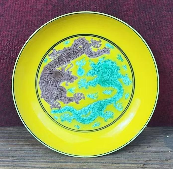名称:清光绪黄地素三彩二龙戏珠纹盘