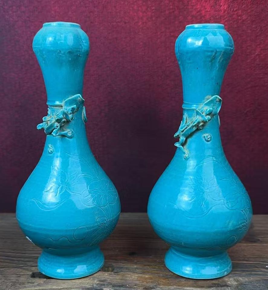 元孔雀蓝釉盘螭龙纹蒜头瓶