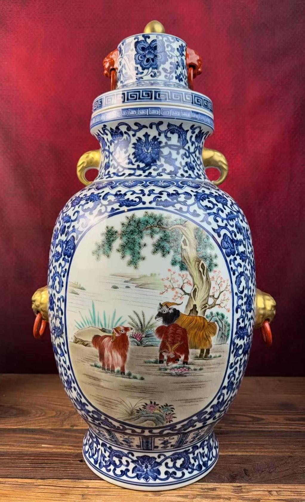 清乾隆青花珐琅彩描金开窗动物纹双耳盖罐
