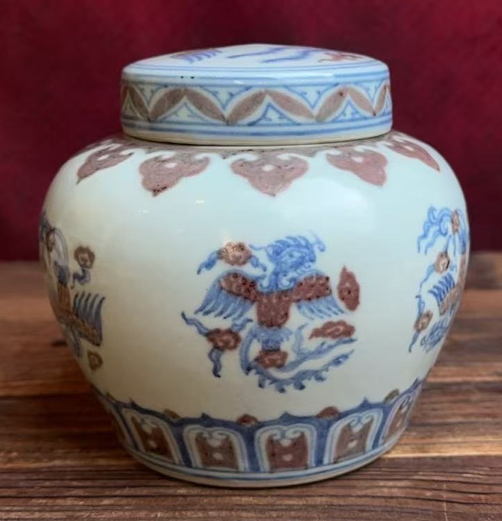 名称:明宣德青花釉里红团凤纹盖罐