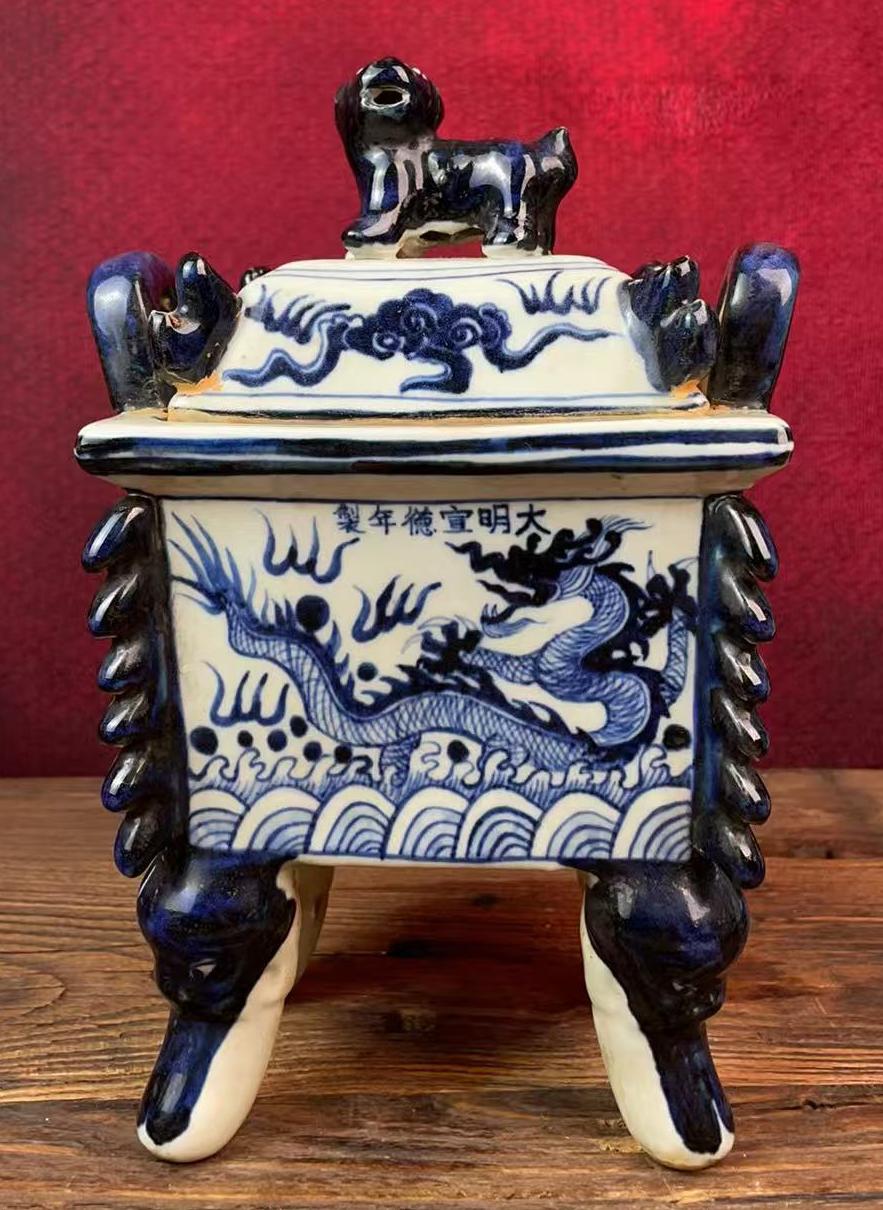 名称:明宣德青花海水龙纹兽钮鼎式炉