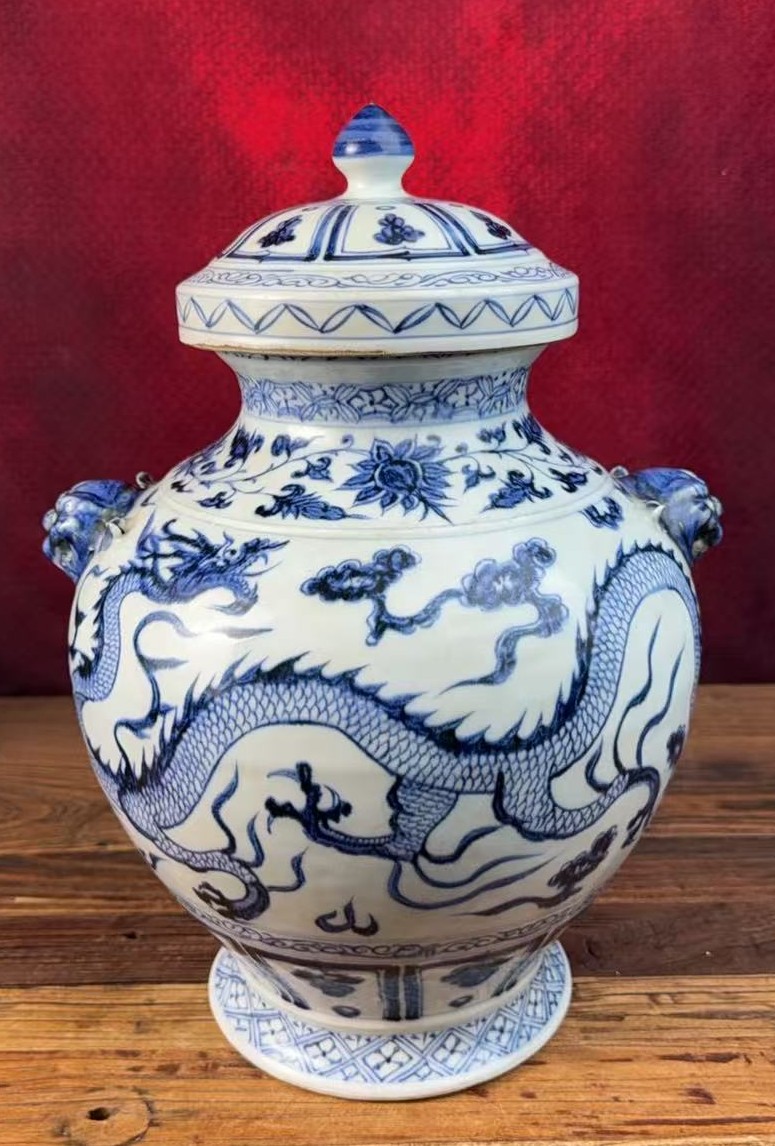 名称:元青花双兽耳龙纹盖罐