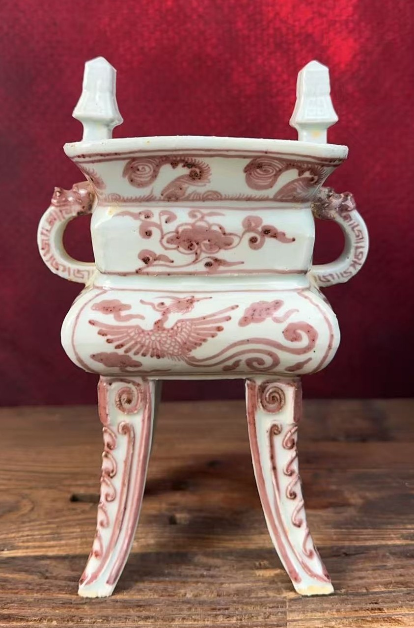 名称:元釉里红云凤纹鼎式炉