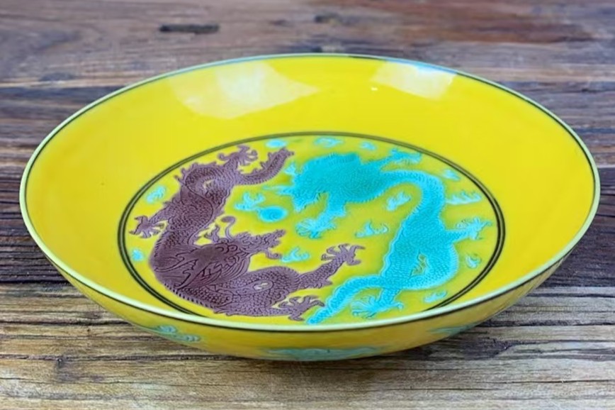 名称:清道光素三彩二龙戏珠纹盘