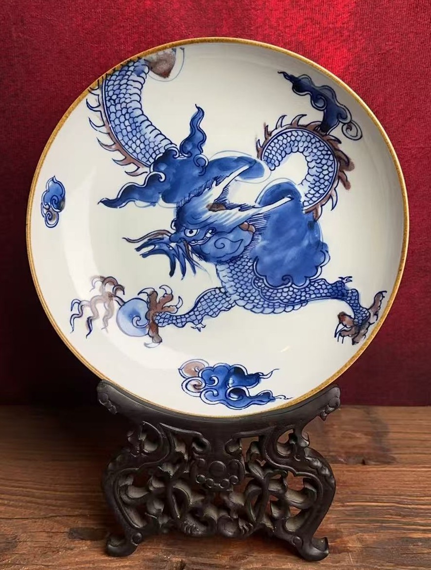名称:清康熙青花釉里红过墙龙纹盘