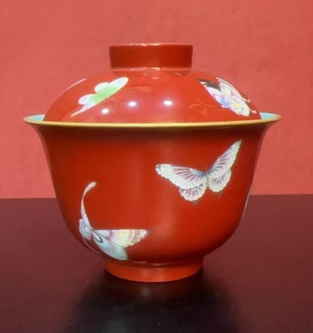 名称:清雍正珊瑚红地珐琅彩百蝶纹盖碗