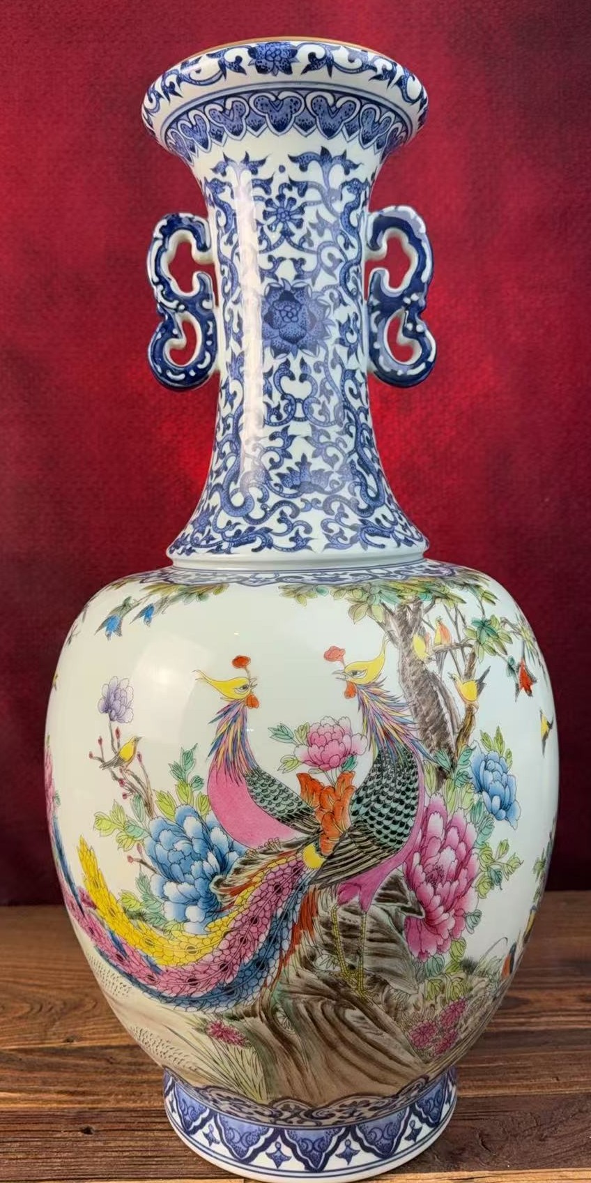 名称:清乾隆青花珐琅彩通景花鸟纹双耳瓶