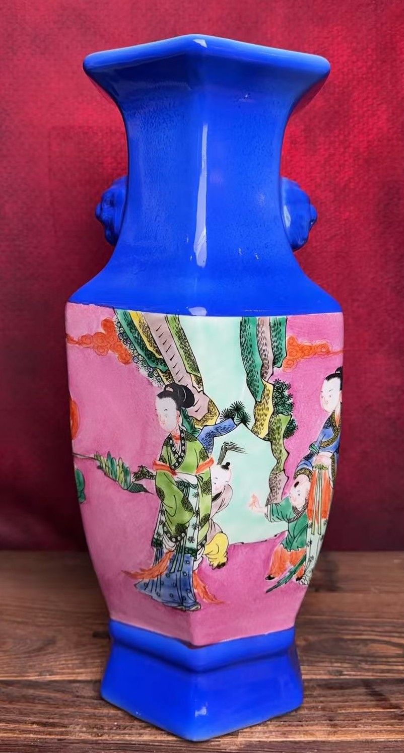 名称:清康熙蓝釉五彩通景三娘教子图六方瓶