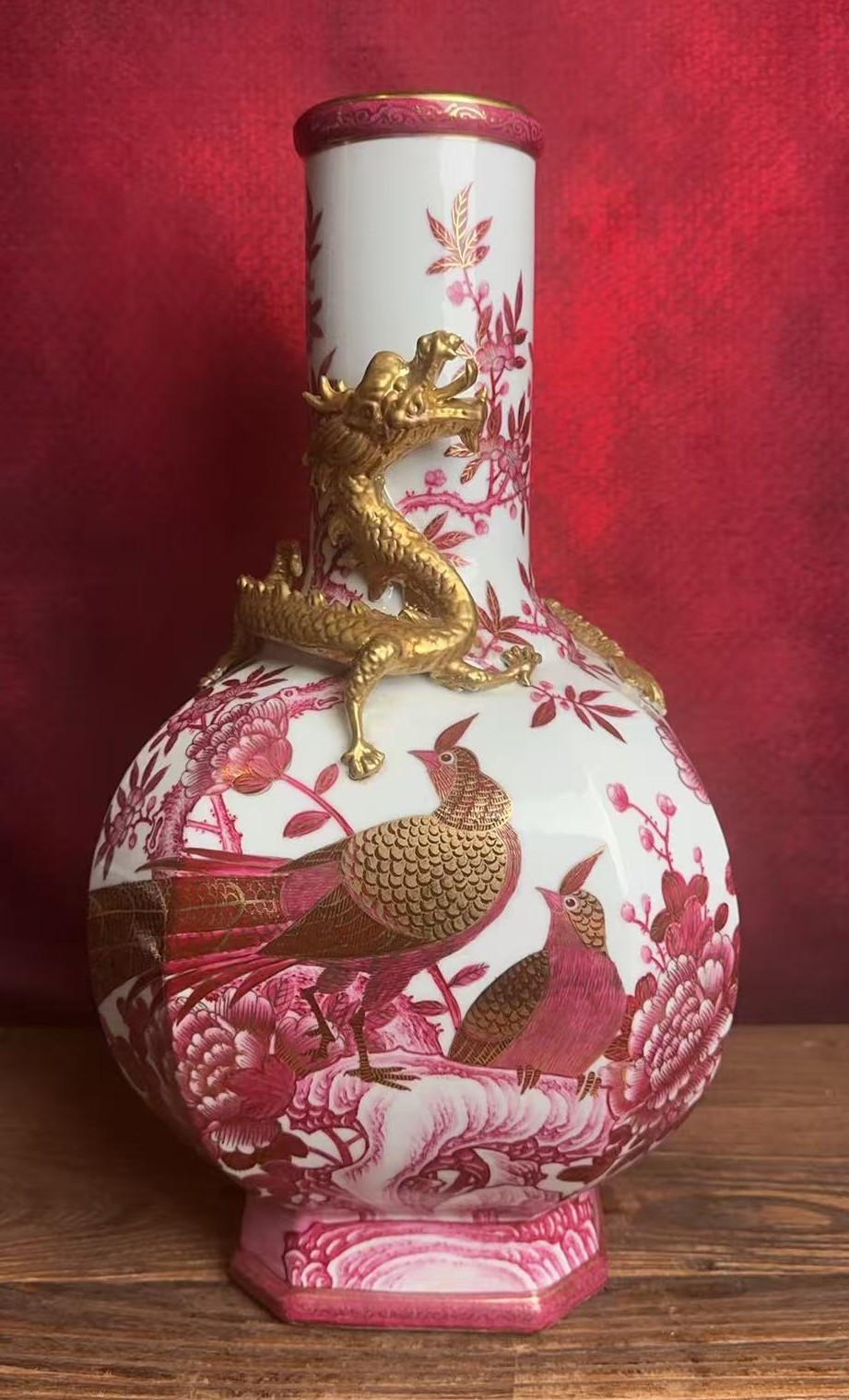 名称:清雍正胭脂红釉描金花鸟纹浮雕龙纹长颈瓶