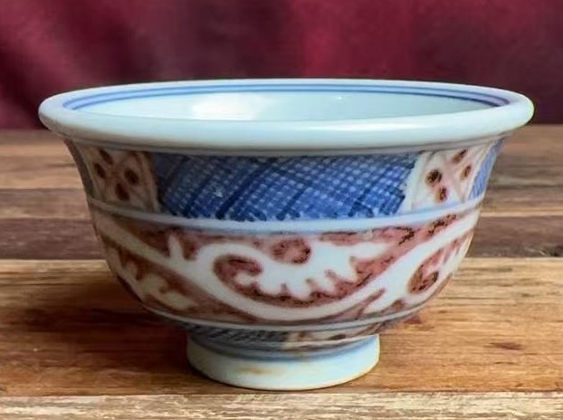 名称:明宣德青花釉里红几何纹杯