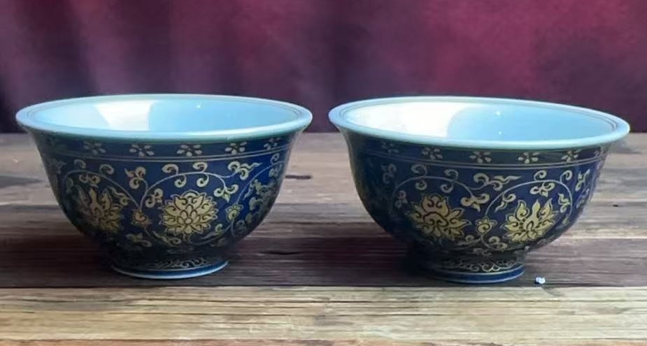 名称:明永乐霁蓝釉描金缠枝莲纹压手杯
