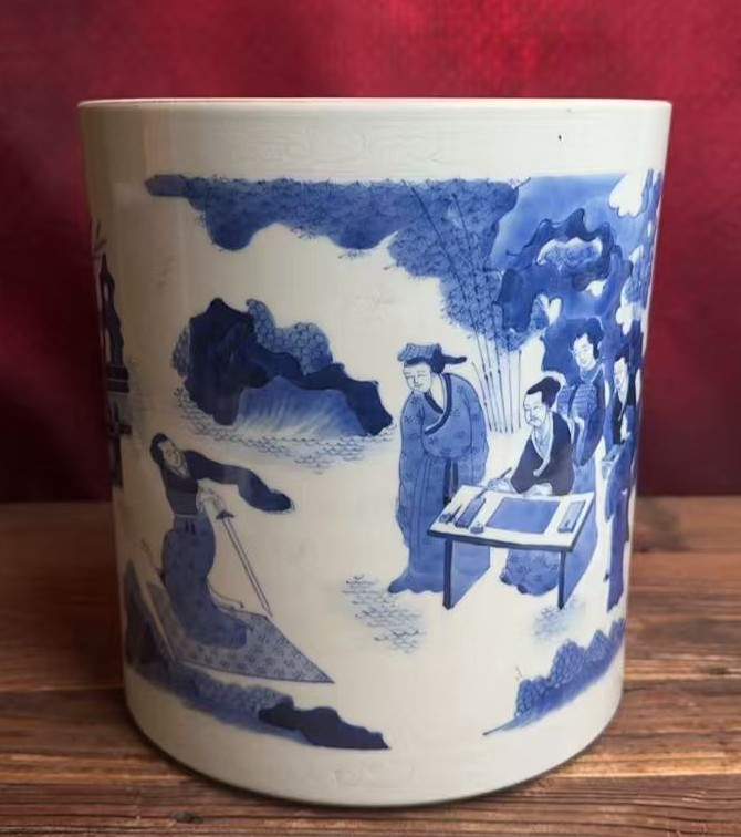 名称:明崇祯青花人物故事纹笔筒