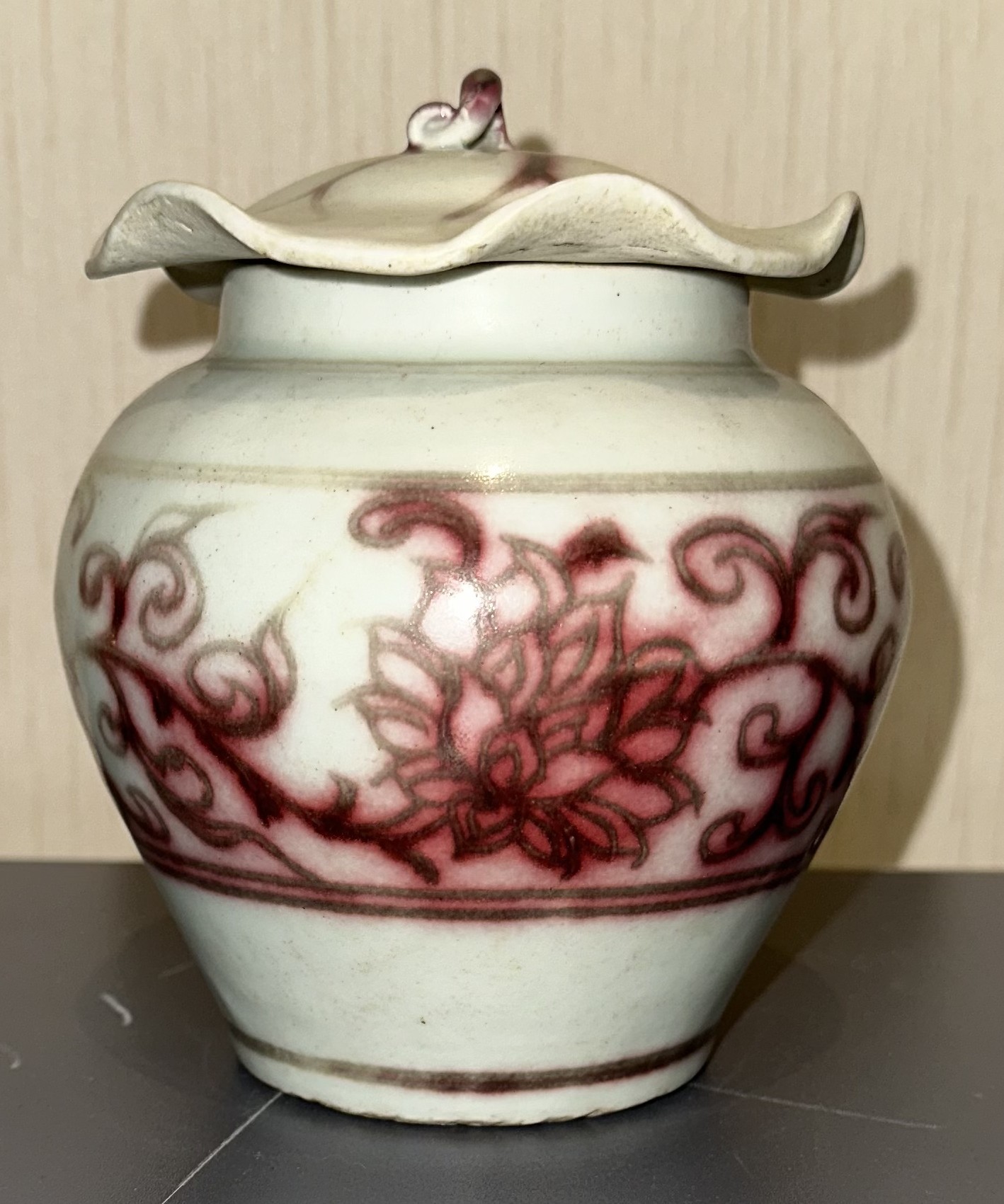 名称:元釉里红缠枝莲纹荷叶罐