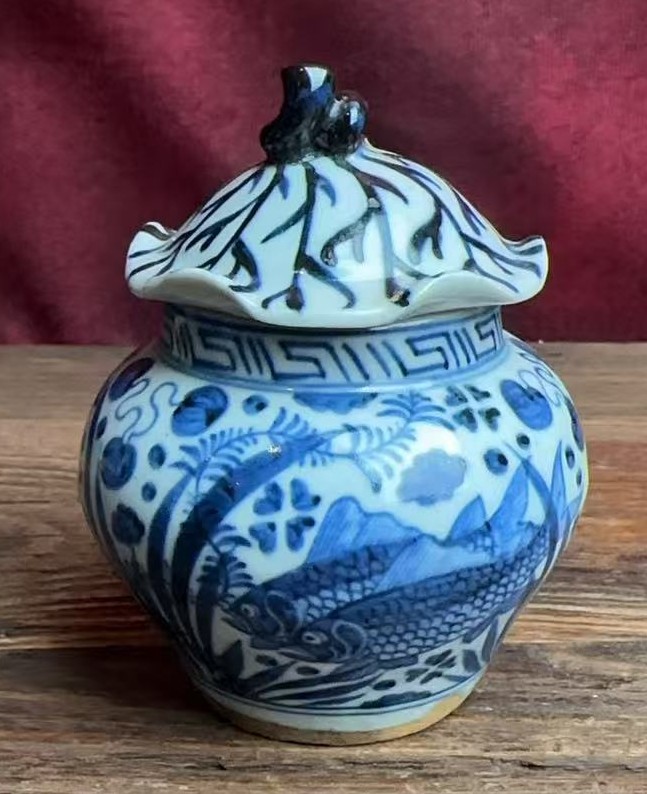 名称:元青花鱼藻纹荷叶罐