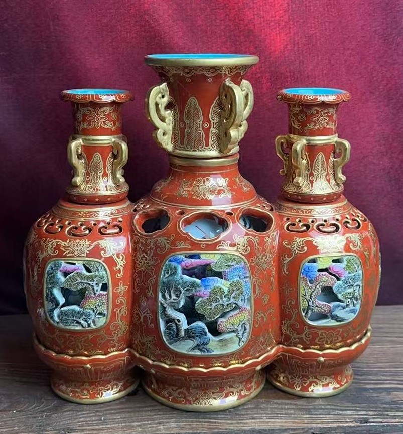 清乾隆洋彩描金镂雕三联转心瓶