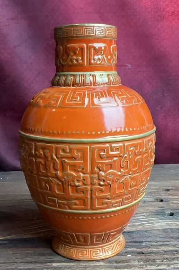 清乾隆矾红描金浮雕夔龙纹直口尊