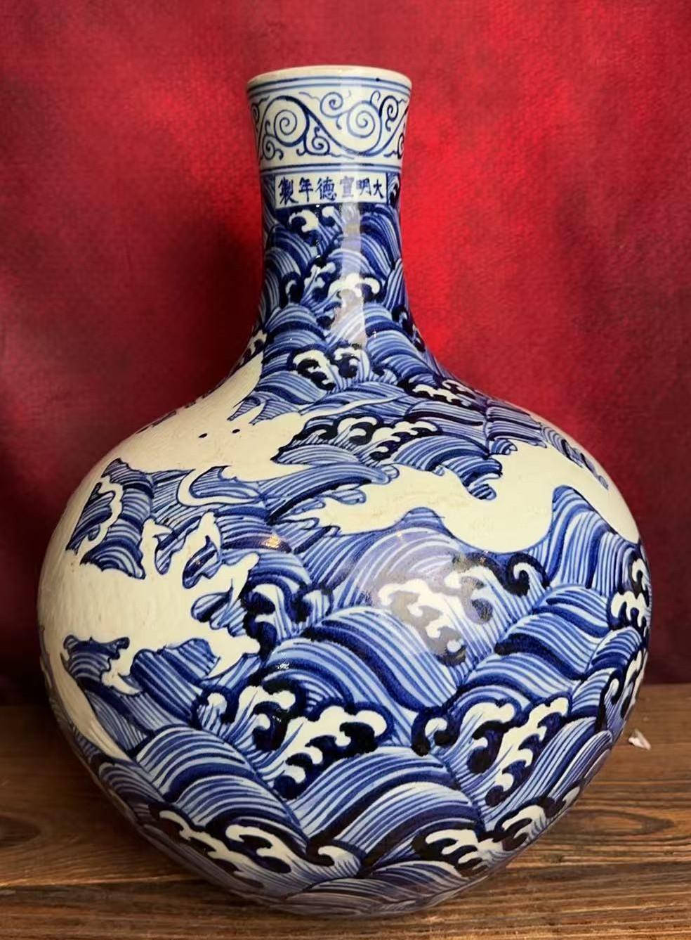 名称:明宣德青花留白海水龙纹天球瓶