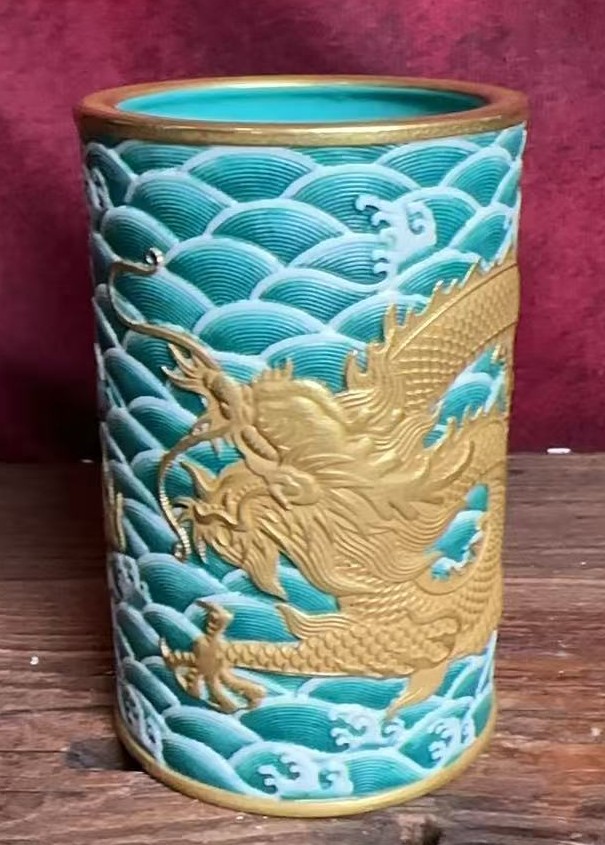 名称:清乾隆粉彩描金浮雕海水龙纹笔筒