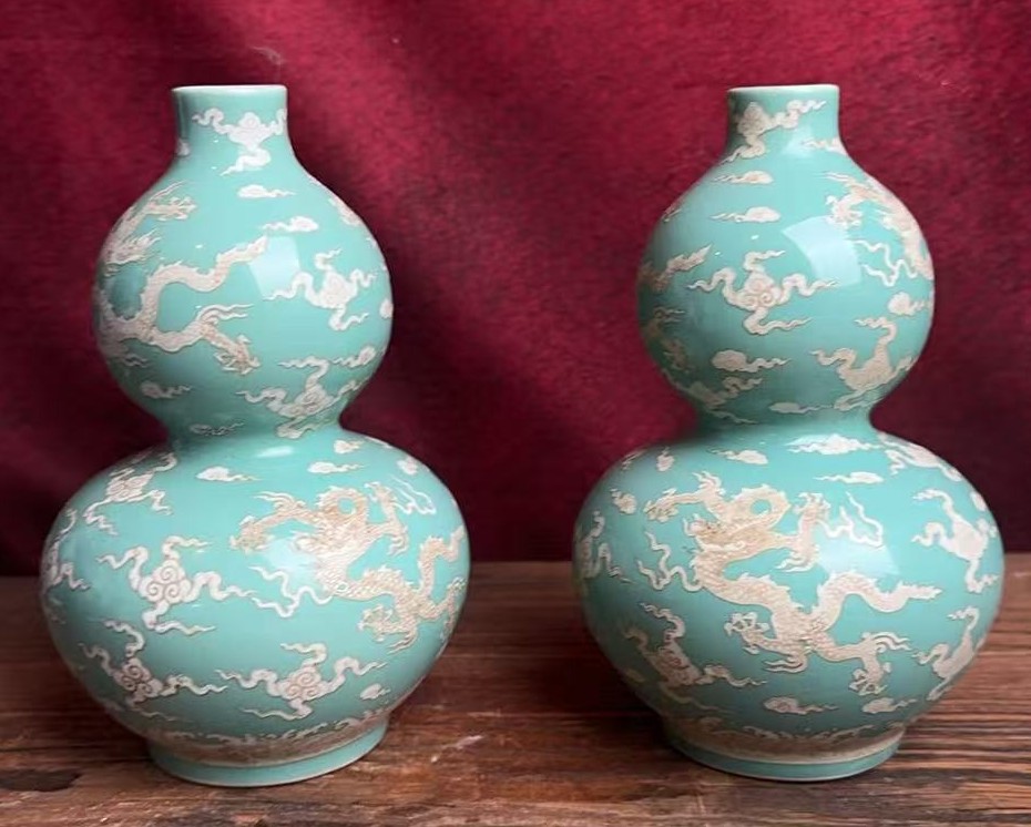 名称:明成化天青釉留白描金云龙纹葫芦瓶