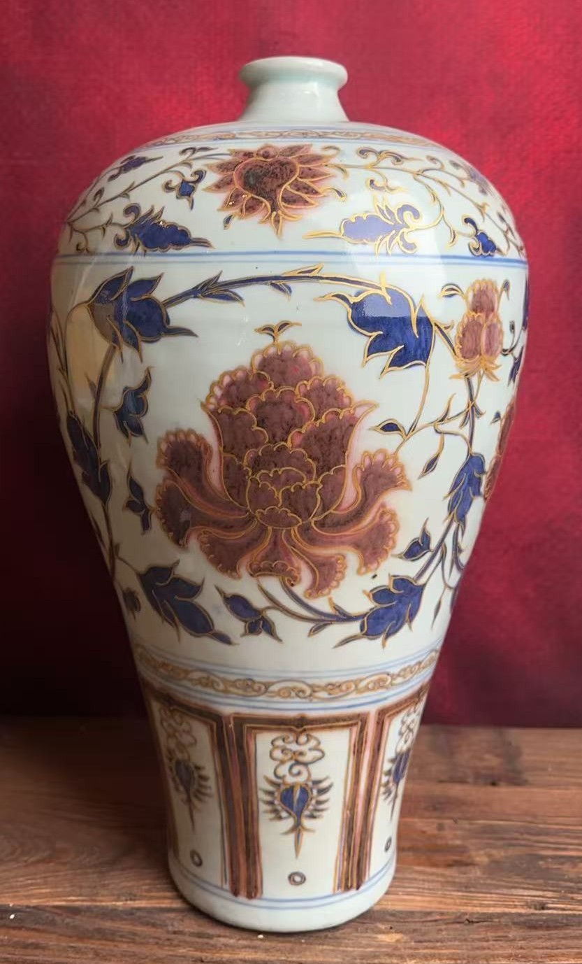 名称:白浒孤窑青花釉里红缠枝牡丹纹梅瓶