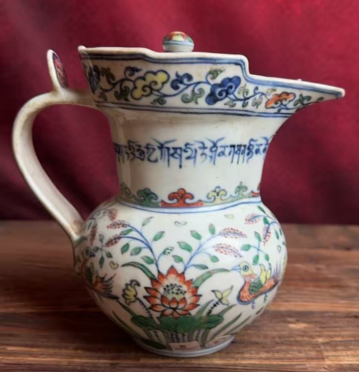 名称:明宣德斗彩莲池鸳鸯纹僧帽壶