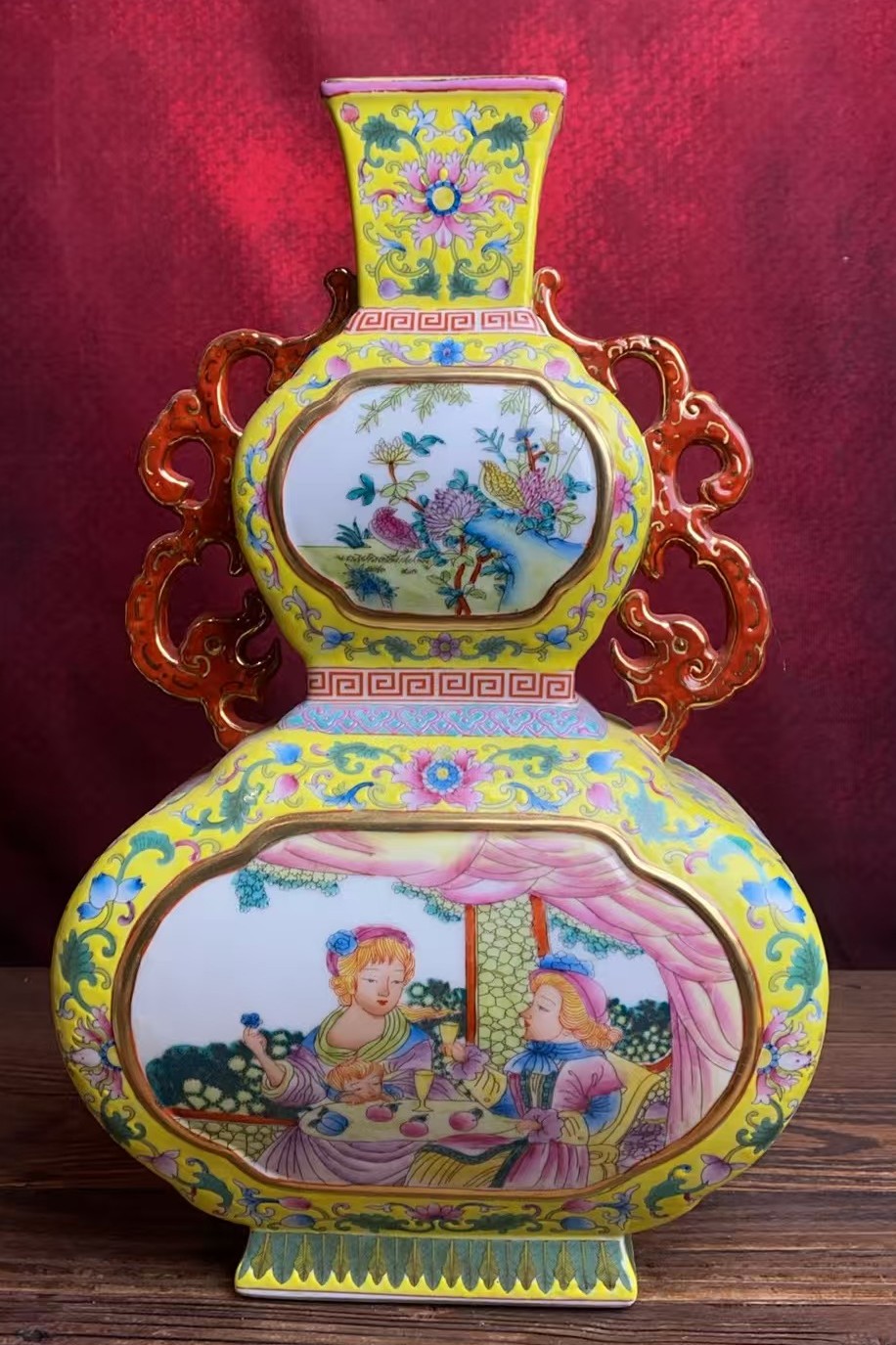 清乾隆珐琅彩开窗西洋人物纹双耳扁瓶