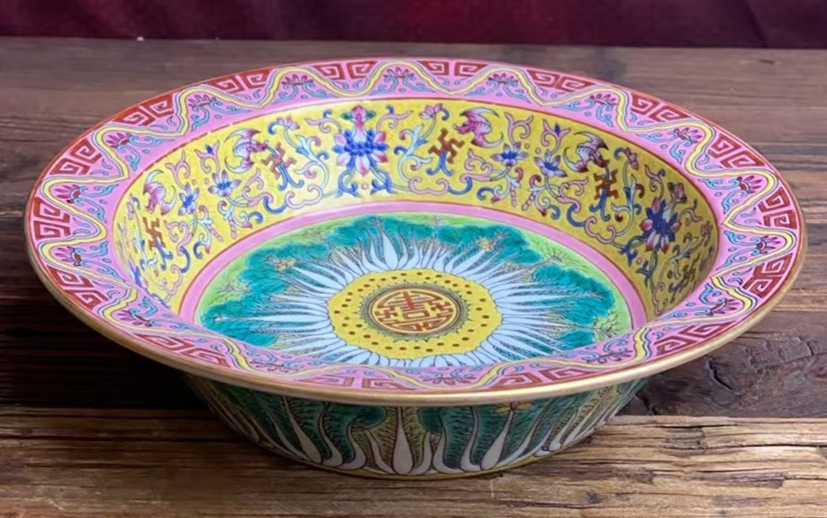 清雍正珐琅彩缠枝牡丹寿字纹折沿盘